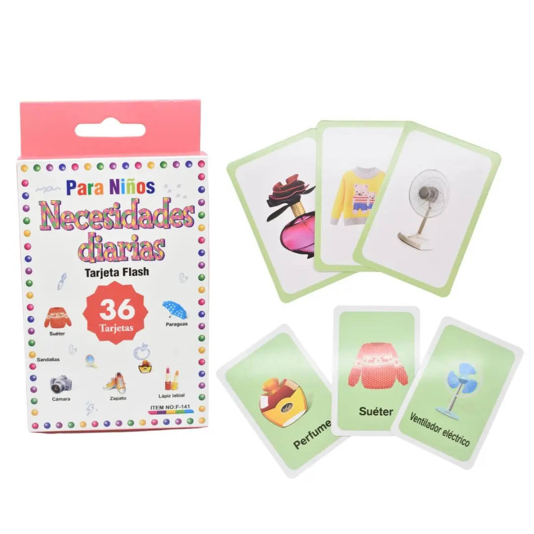 Estas cartas didácticas de necesidades diarias son una herramienta educativa ideal para fortalecer el vocabulario y el reconocimiento de objetos en los primeros años de aprendizaje. Cada carta incluye una foto real de un artículo cotidiano y, en el reverso, su nombre, lo que facilita la asociación visual y verbal.