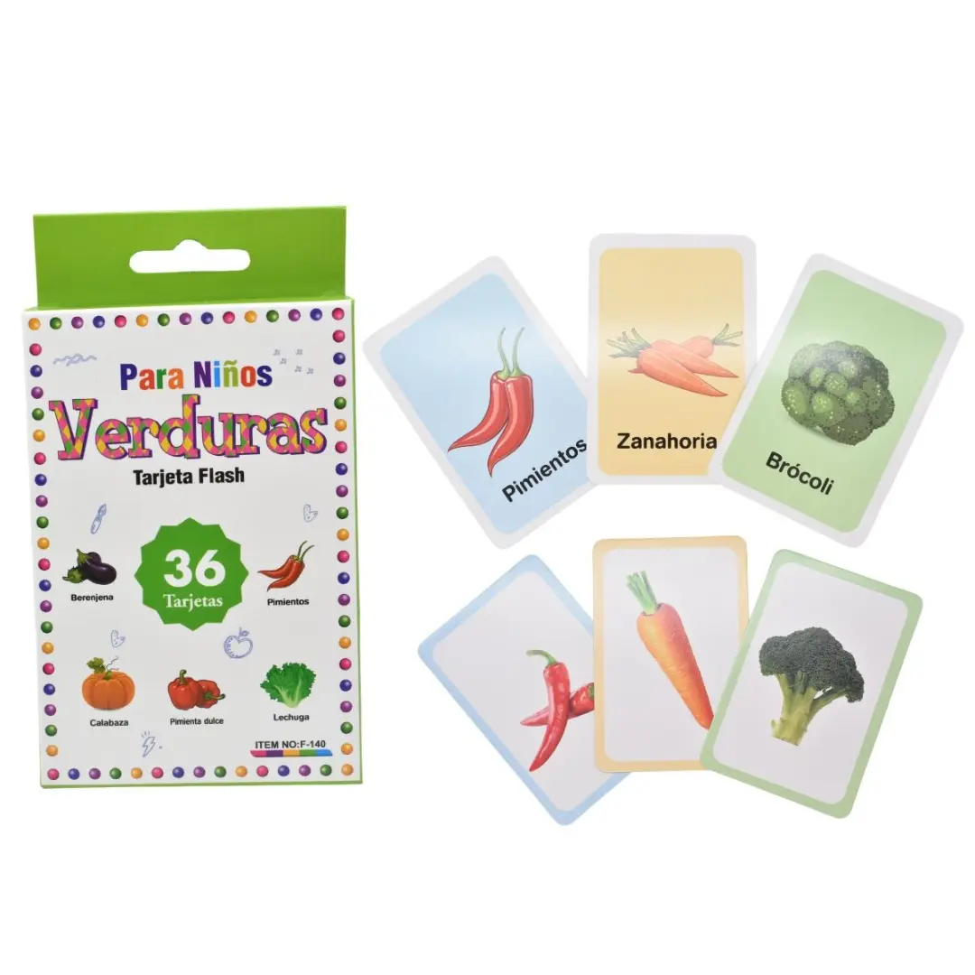 Estas cartas didácticas de verduras son ideales para ayudar a los niños a reconocer alimentos mientras fortalecen su vocabulario y memoria. Cada carta incluye una foto real de una verdura y, en el reverso, su nombre, lo que facilita el aprendizaje por asociación visual.