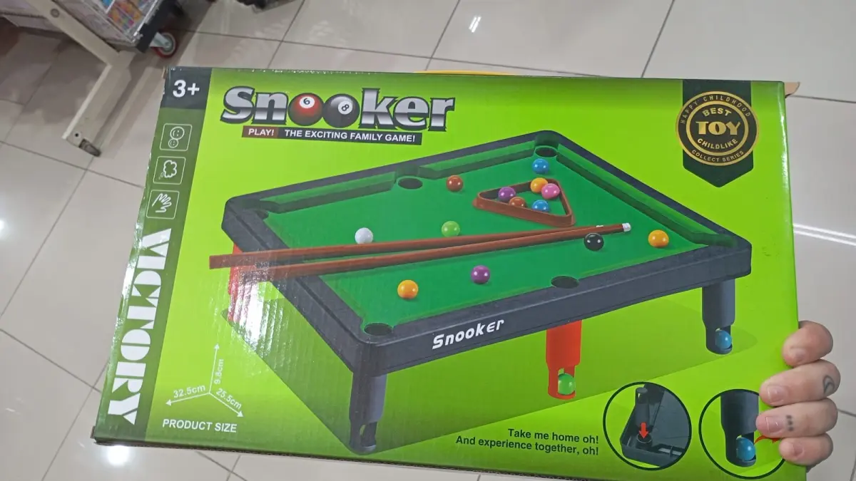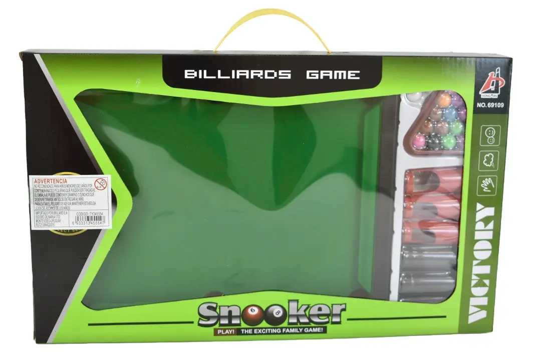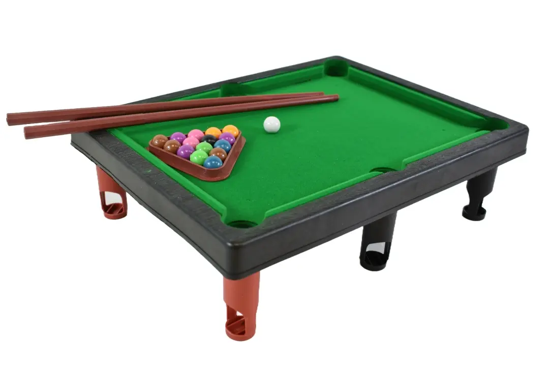 Juego mesa de poolMedidas aproximadas de la mesa: 32.5 x 25.5 x 9.8cm.En caja.Incluye: patas encastrables, 2 tacos, bolas y triángulo.